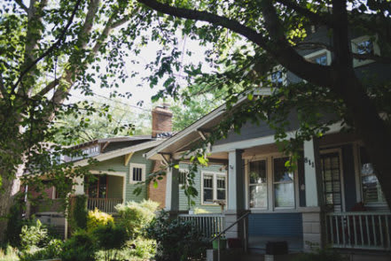 A mixture of older homes and apartments with newer construction combining residence and retail.