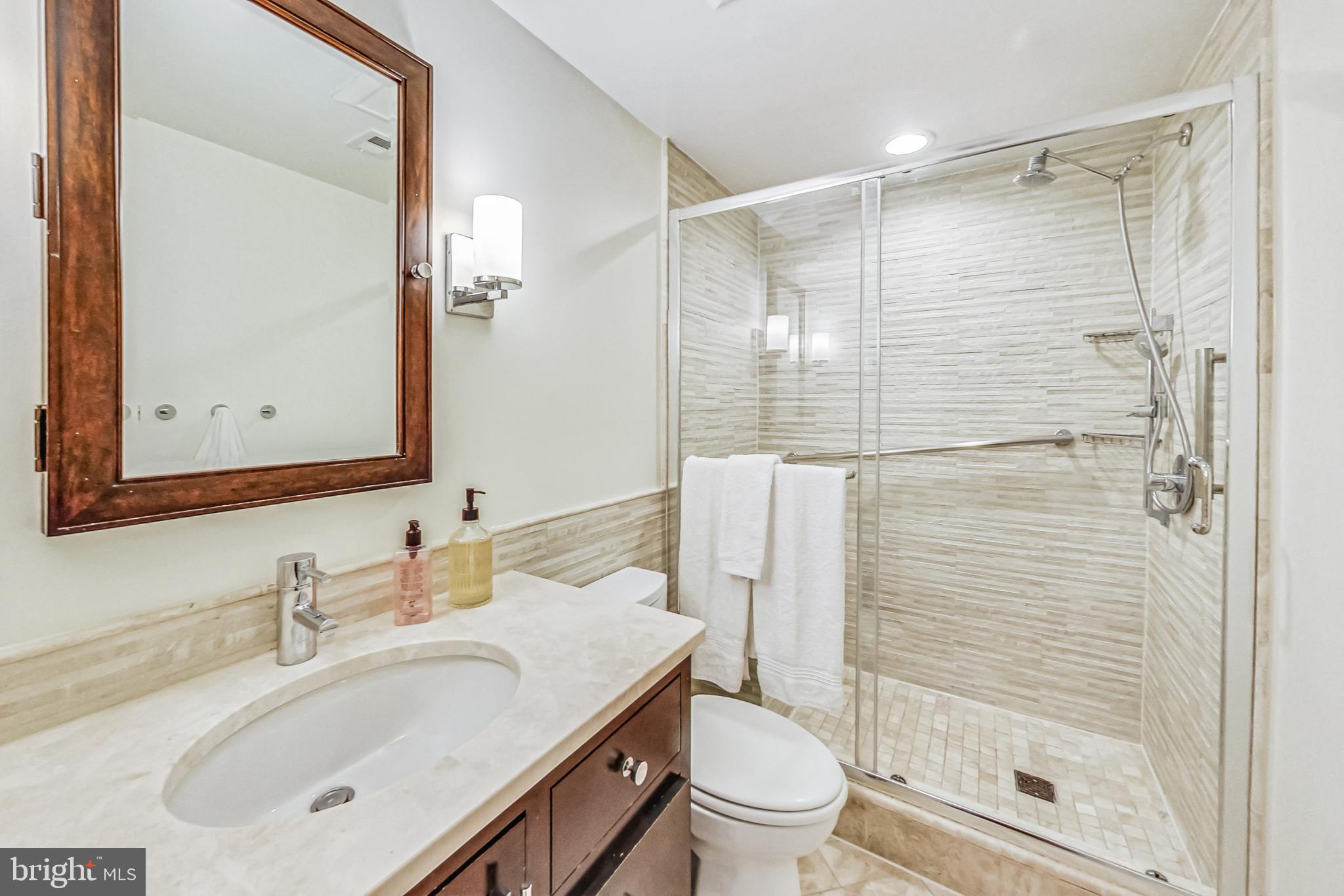 As you step inside your private exterior entrance, you are greeted by a large living room that provides a warm and inviting atmosphere filled with natural light for entertaining guests or unwinding after a long day. Handsome hardwood floors lead to the adjacent formal dining area and generous kitchen complete with stainless steel appliances, new stone counters/backsplash, and an oversized eat-in breakfast bar. After dinner you can relax in one of the two oversized bedrooms with ensuite baths as you prepare for bed after a long day.